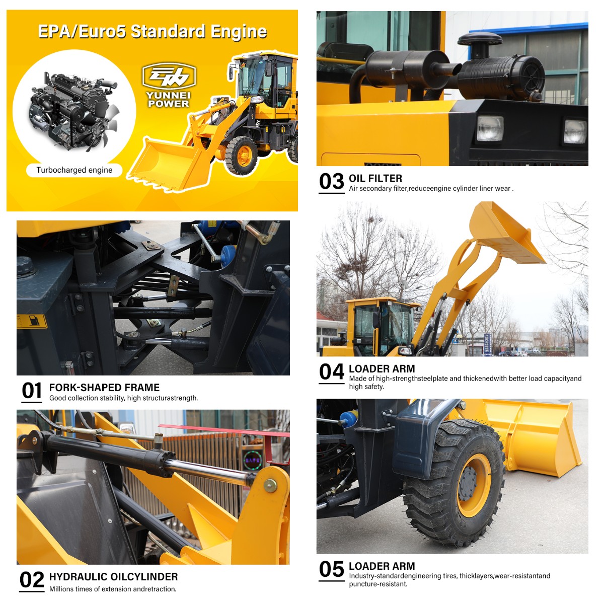 Dotato di un motore da 20,1 kW e di un peso operativo di 2300 kg, garantisce lunga durata e ridotta manutenzione. Gli pneumatici 1000-16 e una struttura robusta riducono i tempi di fermo, rendendolo conveniente per impieghi gravosi.